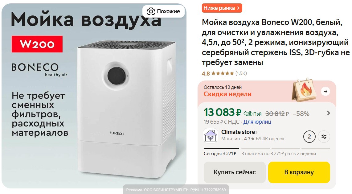 • Мойка воздуха Boneco W200 с кодом: 100RUB-AF за 12989₽. Два режима работы, высокая производительность, не требует сменных фильтров оснащена ионизирующим серебряным стержнем и LED-индикатором. Есть Boneco W400 на площадь до 60² за 23131₽.