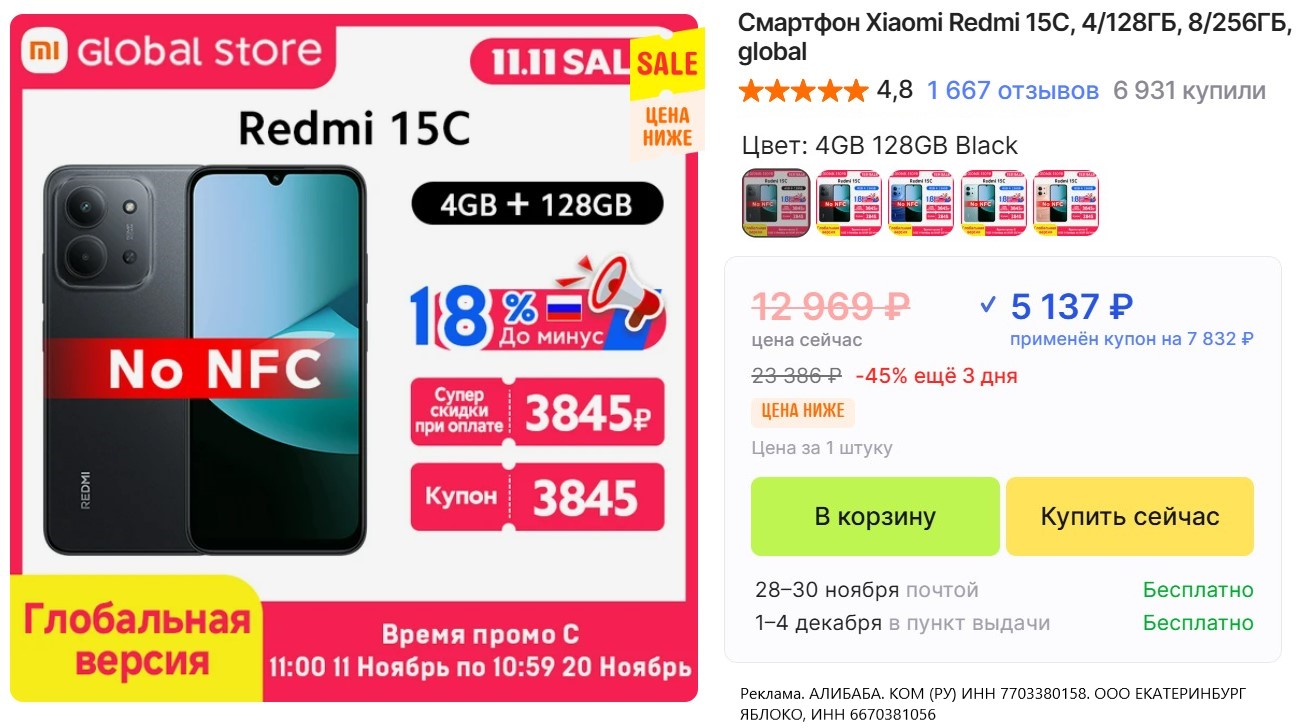 • Смартфон Xiaomi Redmi 15C, 4/128ГБ за 5137₽ с купоном и скидкой в корзине, ещё есть 8/256 Гб за 6627₽. Экран 6.9" 120 Гц, процессор MediaTek Helio G81, основная камера 50 МП, аккумулятор 6000 мАч с зарядкой 33 Вт.
