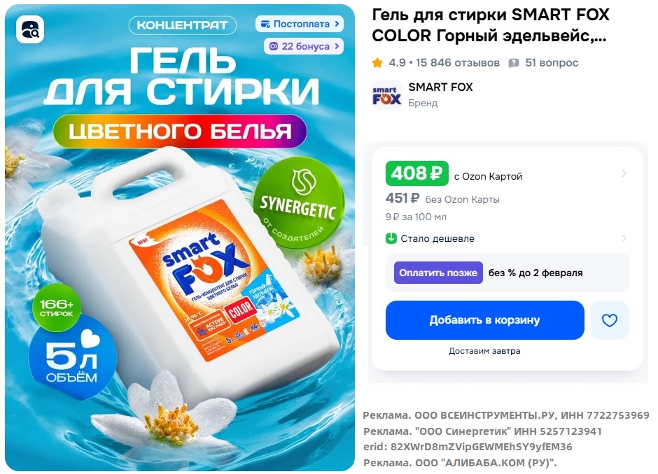 • Гель для стирки SMART FOX COLOR Горный эдельвейс, концентрат, 5 л за 399₽ с Ozon Картой. Без фосфатов и хлора, концентрированное и гипоаллергенное средство, хорошо отстирывает и сохраняет яркость тканей.