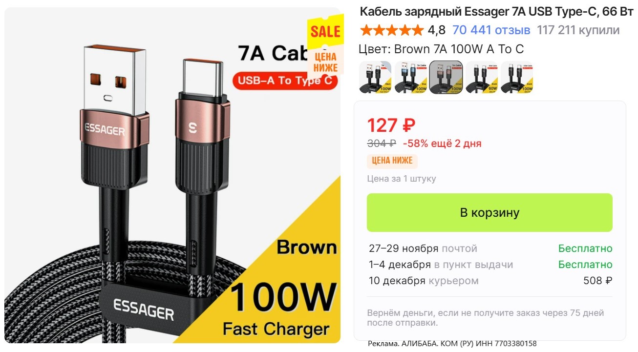 • Зарядный кабель Essager 7 А за 127₽. Шнур длиной 1 м в нейлоновой оплётке со штекерами USB и Type-C поддерживает быструю зарядку мощностью 100 Вт, а также передачу данных со скоростью до 480 Мбит/с.