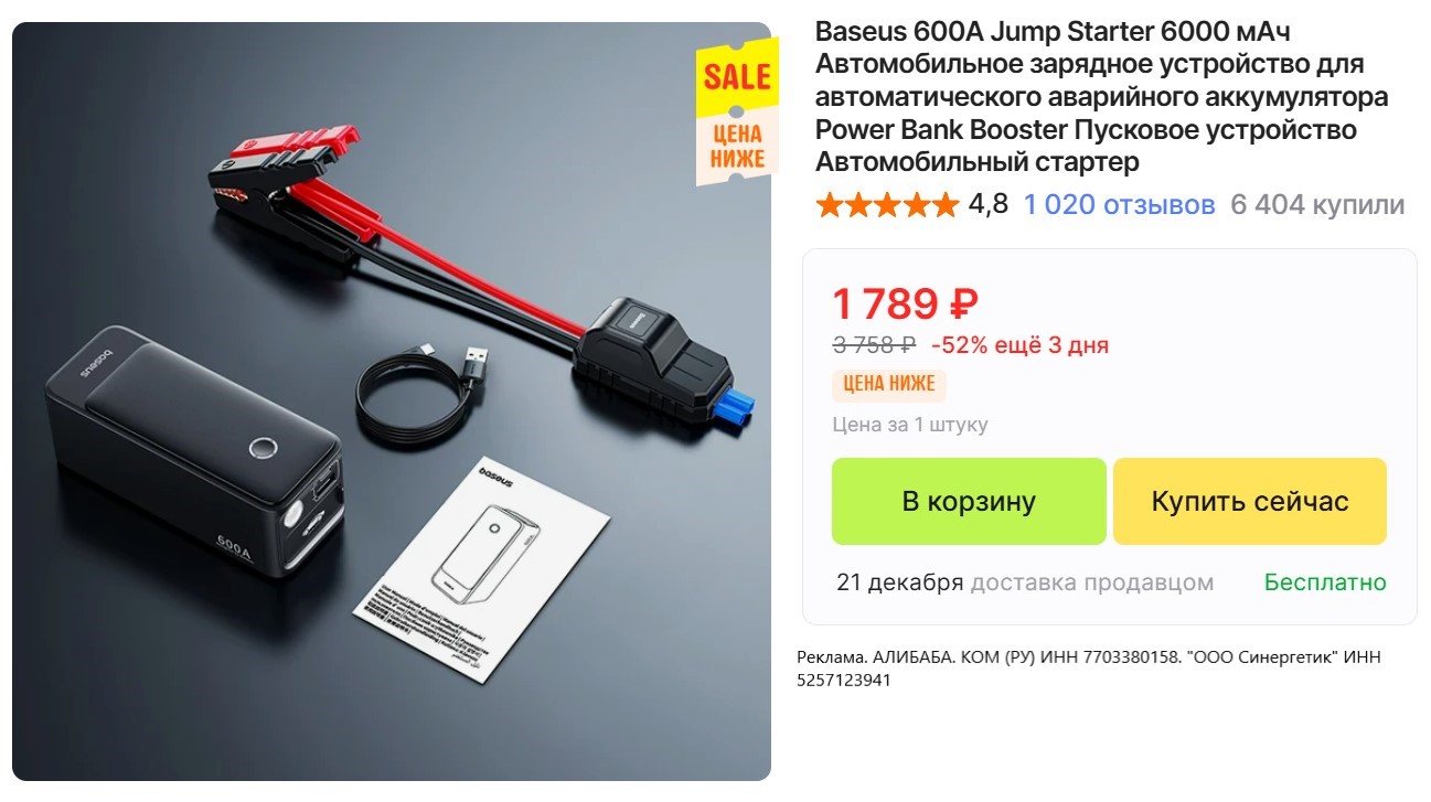 • Пуско-зарядное устройство Baseus BS-CH006 за 1789₽. У нас в 2 раза дороже. Ёмкость 6000 мАч, пиковый ток 600 А, есть фонарик.