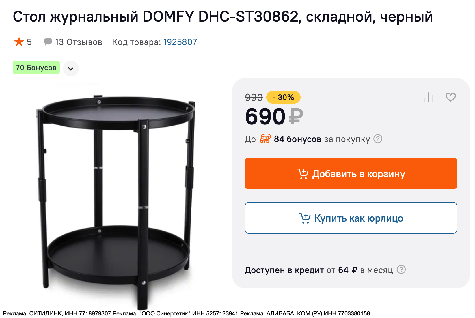 • Стол журнальный DOMFY DHC-ST30862 за 690₽. Изготовлен из стали с долговечным полимерным порошковым покрытием, размер 41.7х41.7х41.7 см, каждая полка выдерживает до 10 кг.