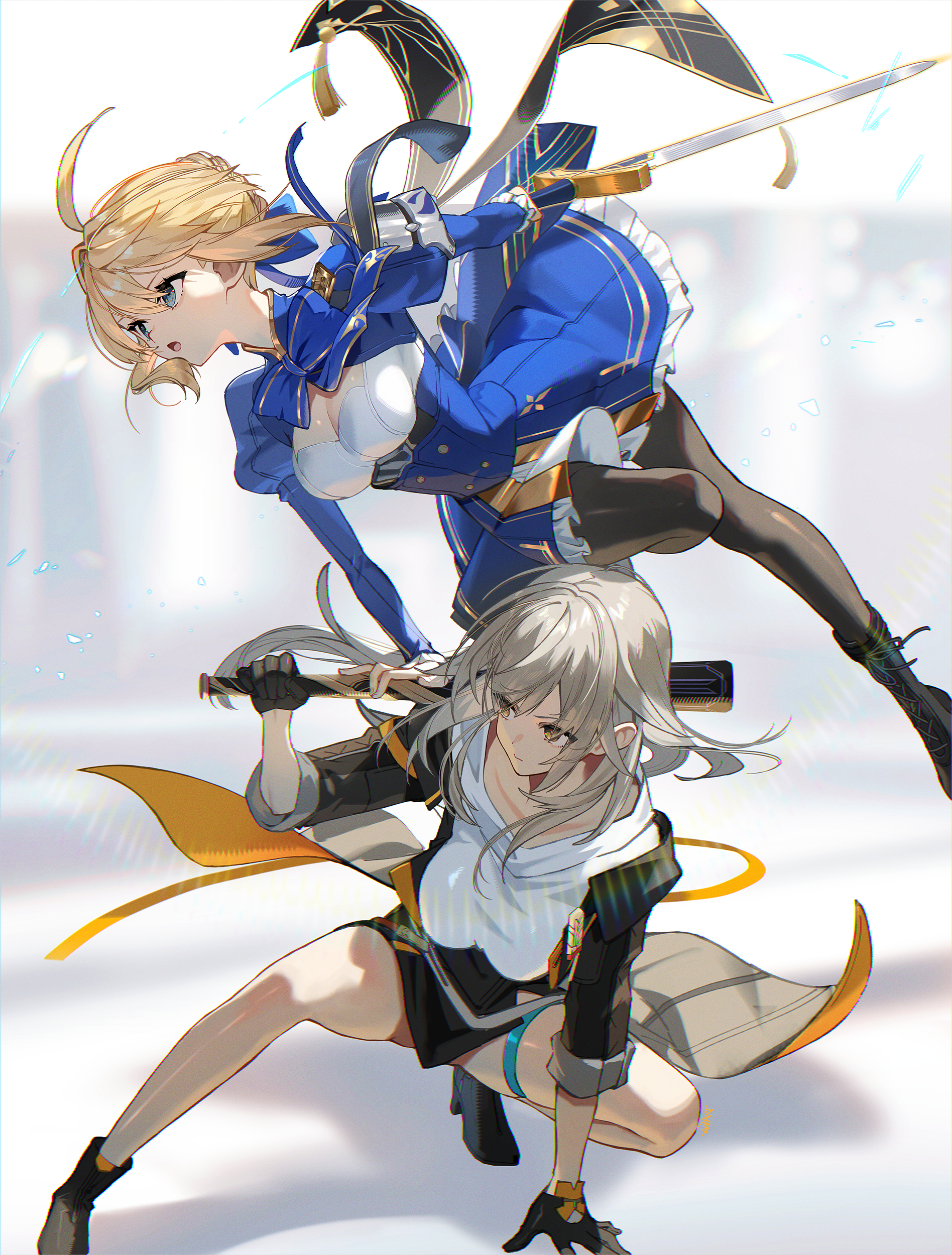 #armor #artoria_pendragon_(fate) #crossover #fate/stay_night #garter #honkai:_star_rail #pantyhose #scottie #skirt_lift #stelle #sword #weapon