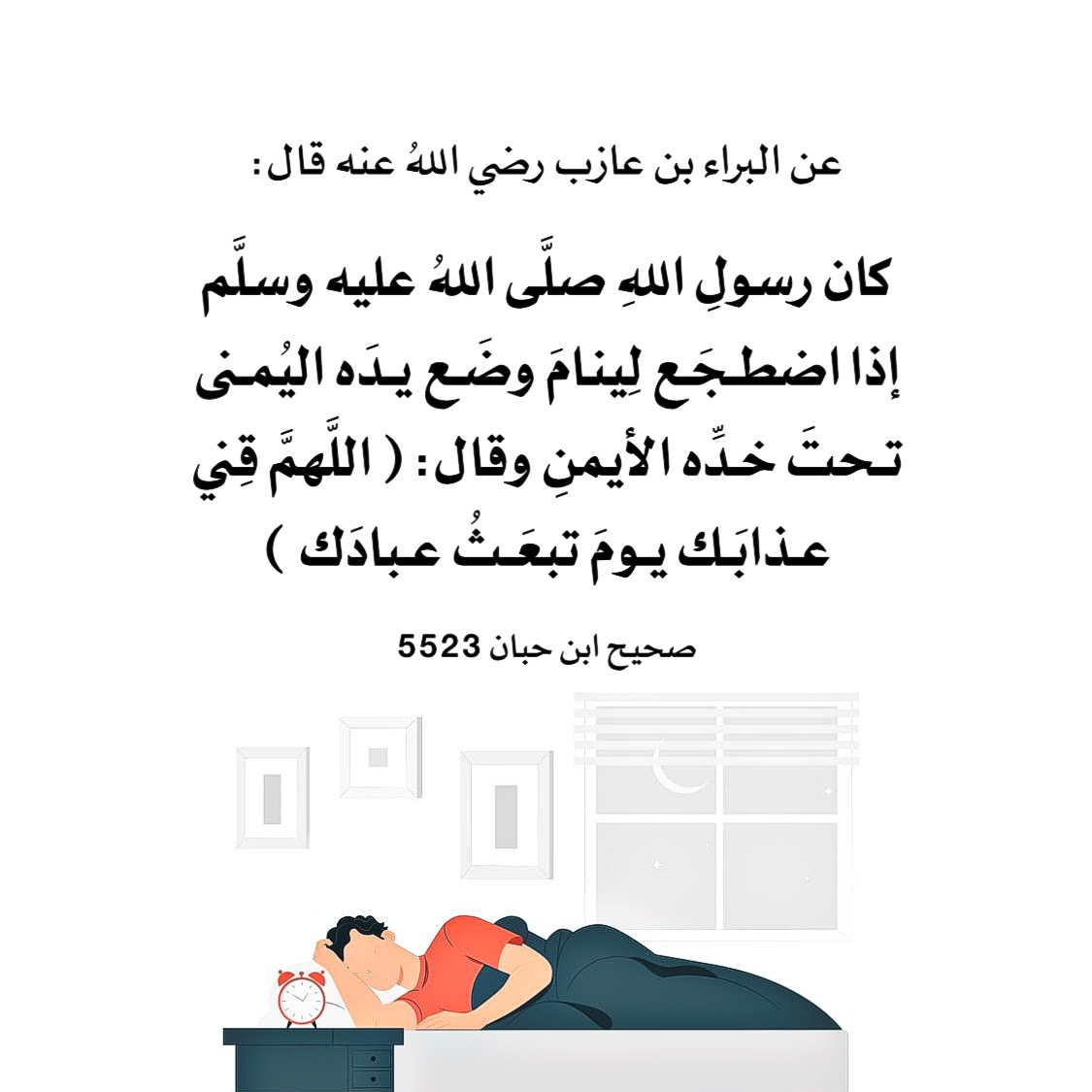 كان رسولِ اللهِ صلَّى اللهُ عليه وسلَّم إذا اضطجَع لِينامَ وضَع يدَه اليُمنى تحتَ خدِّه الأيمنِ وقال: ( اللَّهمَّ قِني عذابَك يومَ تبعَثُ عبادَك ) .