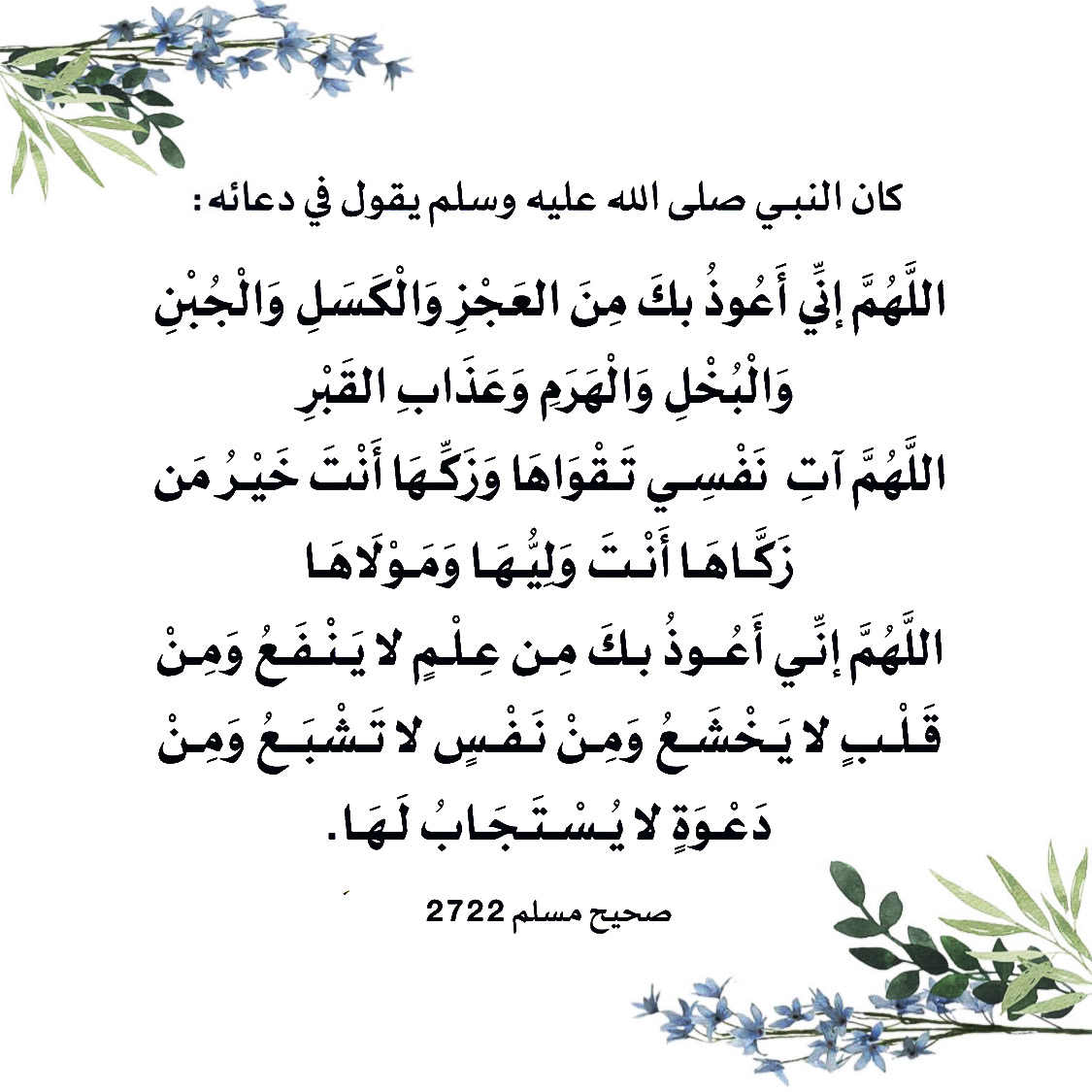 كانَ رَسولُ اللهِ صَلَّى اللَّهُ عليه وَسَلَّمَ يقول في دعائه : اللَّهُمَّ إنِّي أَعُوذُ بكَ مِنَ العَجْزِ وَالْكَسَلِ، وَالْجُبْنِ وَالْبُخْلِ، وَالْهَرَمِ، وَعَذَابِ القَبْرِ، اللَّهُمَّ آتِ نَفْسِي تَقْوَاهَا، وَزَكِّهَا أَنْتَ خَيْرُ مَن زَكَّاهَا، أَنْتَ وَلِيُّهَا وَمَوْلَاهَا، اللَّهُمَّ إنِّي أَعُوذُ بكَ مِن عِلْمٍ لا يَنْفَعُ، وَمِنْ قَلْبٍ لا يَخْشَعُ، وَمِنْ نَفْسٍ لا تَشْبَعُ، وَمِنْ دَعْوَةٍ لا يُسْتَجَابُ لَهَا.