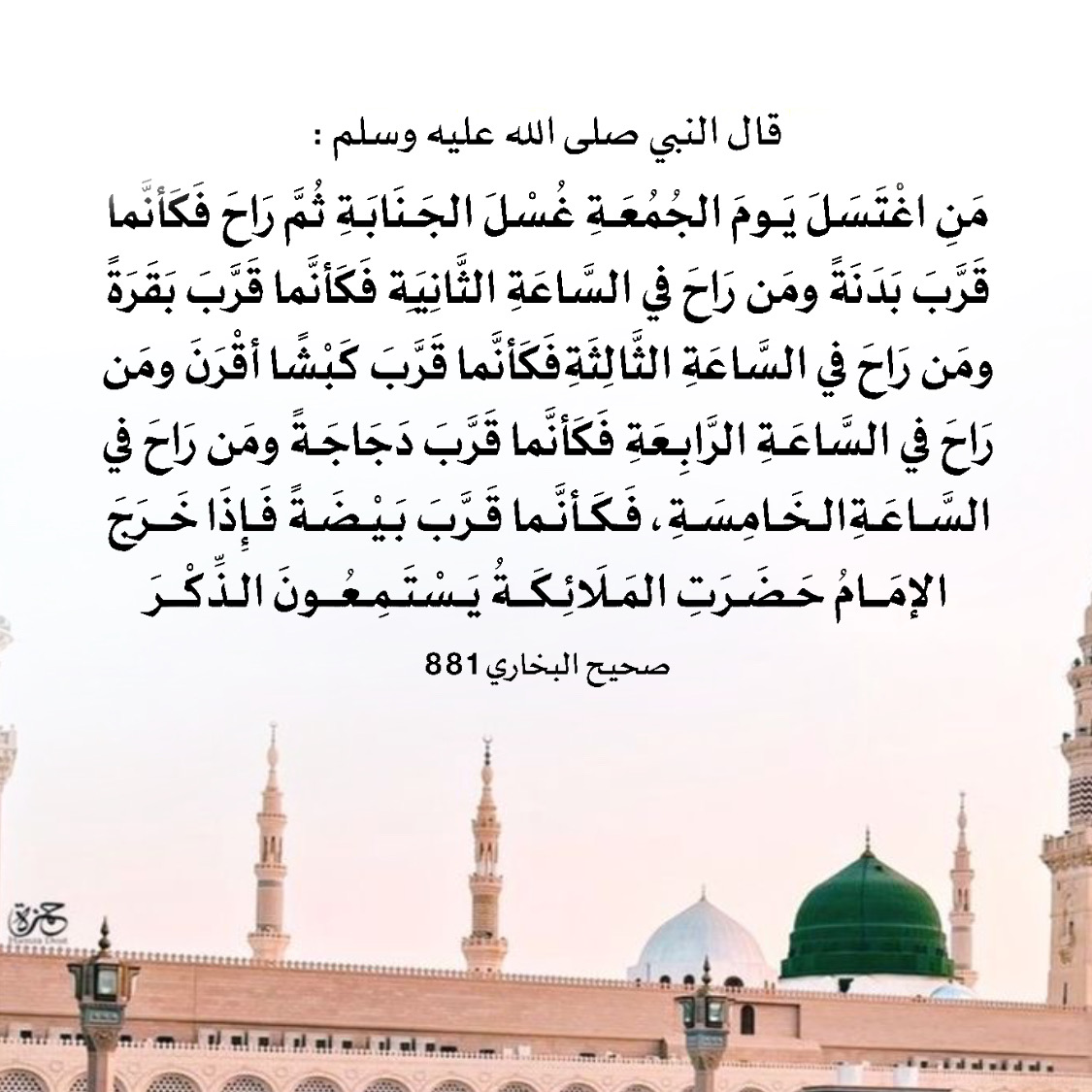 قال النبي صلى الله عليه وسلم : ( مَنِ اغْتَسَلَ يَومَ الجُمُعَةِ غُسْلَ الجَنَابَةِ ثُمَّ رَاحَ، فَكَأنَّما قَرَّبَ بَدَنَةً، ومَن رَاحَ في السَّاعَةِ الثَّانِيَةِ، فَكَأنَّما قَرَّبَ بَقَرَةً، ومَن رَاحَ في السَّاعَةِ الثَّالِثَةِ، فَكَأنَّما قَرَّبَ كَبْشًا أقْرَنَ، ومَن رَاحَ في السَّاعَةِ الرَّابِعَةِ، فَكَأنَّما قَرَّبَ دَجَاجَةً، ومَن رَاحَ في السَّاعَةِ الخَامِسَةِ، فَكَأنَّما قَرَّبَ بَيْضَةً، فَإِذَا خَرَجَ الإمَامُ حَضَرَتِ المَلَائِكَةُ يَسْتَمِعُونَ الذِّكْرَ ).