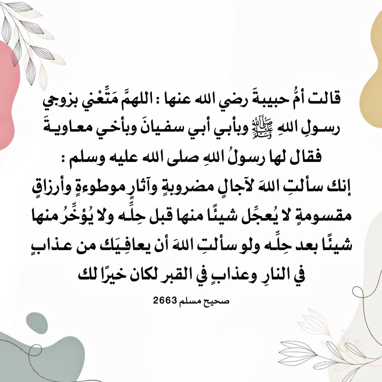 قالت أمُّ حبيبةَ : اللهمَّ مَتِّعْني بزوجي ، رسولِ اللهِ صلَّى اللهُ عليه وسلَّمَ . وبأبي أبي سفيانَ . وبأخي معاويةَ . فقال لها رسولُ اللهِ صلى الله عليه وسلم: ( إنك سألتِ اللهَ لآجالٍ مضروبةٍ ، وآثارٍ موطوءةٍ ، وأرزاقٍ مقسومةٍ . لا يُعجِّل شيئًا منها قبل حِلِّه . ولا يُؤخِّرُ منها شيئًا بعد حِلِّه . ولو سألتِ اللهَ أن يعافِيَك من عذابٍ في النارِ ، وعذابٍ في القبر ، لكان خيرًا لك )