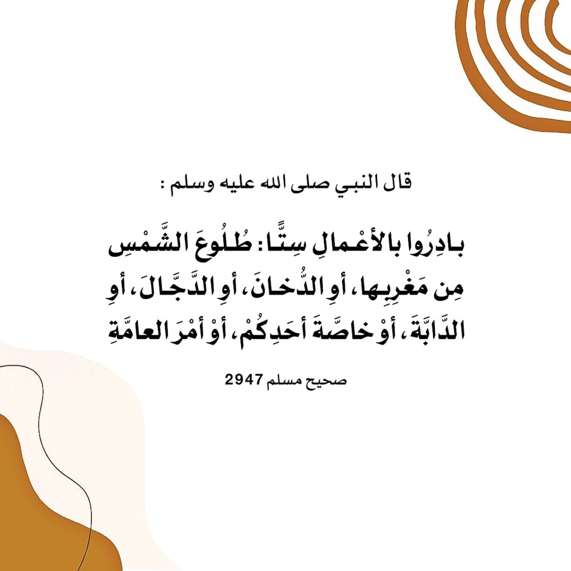قال النبي صلى الله عليه وسلم: ( بادِرُوا بالأعْمالِ سِتًّا: طُلُوعَ الشَّمْسِ مِن مَغْرِبِها، أوِ الدُّخانَ، أوِ الدَّجَّالَ، أوِ الدَّابَّةَ، أوْ خاصَّةَ أحَدِكُمْ، أوْ أمْرَ العامَّةِ ).