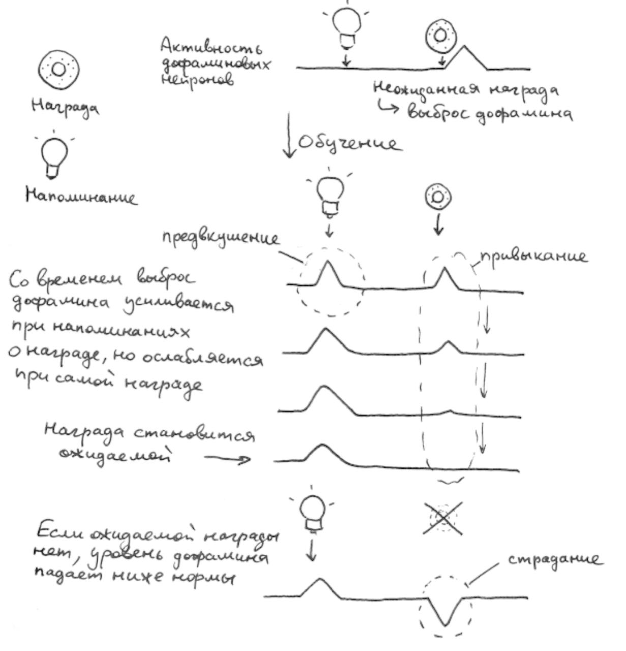 «[…] Это идеально соответствует сегодняшним представлениям о механике системы вознаграждения. Удовольствие вызывается чем-то непредвиденно превышающим ожидания. Это соответствует выбросу дофамина в момент получения нежданной награды. Но через несколько повторений награда уже не будет неожиданной и дофамин перестанет выделяться. Само по себе это, конечно, обидно, но еще терпимо. Самая же главная подлость в том, что если этой когда-то неожиданной, а теперь ожидаемой награды вдруг не поступает, то уровень дофамина падает ниже нормы – «мозговой индекс самооценки» уходит в минус, как акции чем-то провинившейся компании. Ощущается это как раздражение и гнев, то есть страдание.