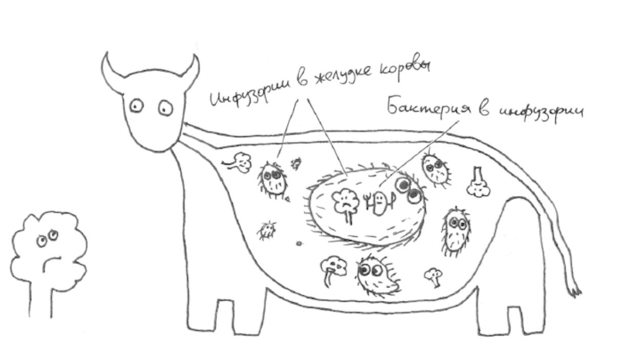 У жвачных, современных экспертов в травоядном деле, все устроено еще более странно. Коровы питаются даже не просто бактериальным супом, а инфузориями, сложными мохнатыми одноклеточными, населяющими рубец, отдел коровьего желудка. Эти инфузории, как это ни смешно, тоже не умеют переваривать целлюлозу и пользуются для питания все теми же бактериальными симбионтами, которых носят внутри своей клетки. Такое многократное превращение энергии означает многократные же потери энергии, что гораздо менее эффективно, чем если бы у коровы просто была собственная целлюлаза.