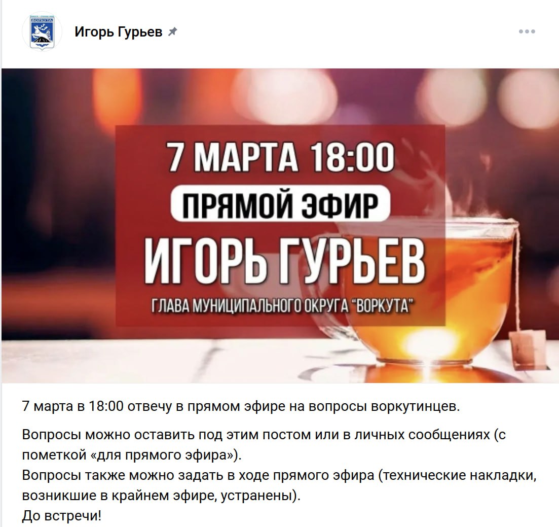 Глава Воркуты Игорь Гурьев объявил о проведении прямой линии с жителями города. Эфир запланирован на 7 марта в 18:00. Воркутинцам предложили заранее оставлять вопросы под соответствующим постом в социальных сетях или отправлять их в личные сообщения.