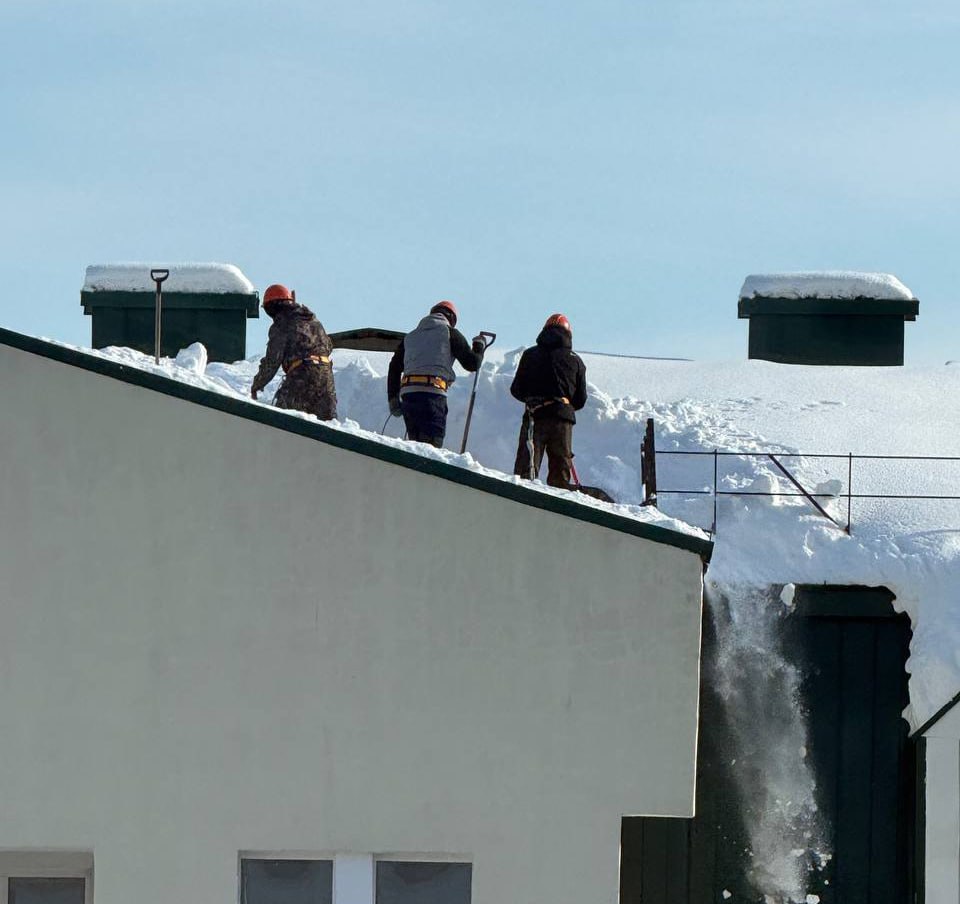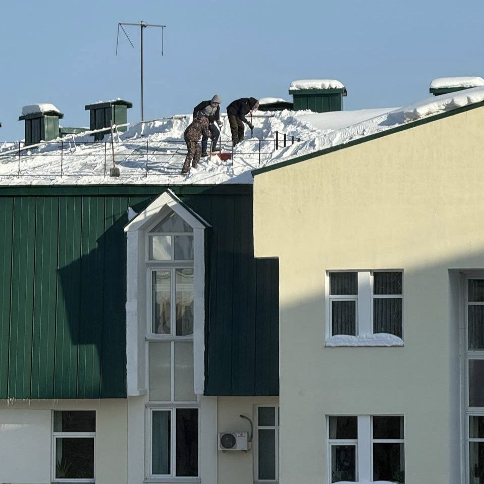 На фотографии видно, как несколько человек находятся на крыше здания и очищают её от снега. При этом у рабочих отсутствуют каски, страховочные тросы и ремни безопасности. Люди фактически работают на высоте без какой-либо защиты от падения.