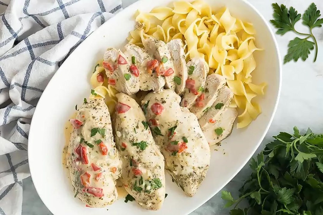 1. Куриные грудки хорошенько промойте под проточной водой и оботрите бумажными полотенцами. Положите курицу на разделочную доску и вырежьте косточки и сорвите кожицу, если таковые есть. Для удобства разрежьте грудки вдоль позвоночника на две равные половинки.2. Соль, черный молотый перец и итальянские травы смешайте в отдельной емкости. Хорошенько натрите смесью из специй куриные грудки со всех сторон.3. Положите приправленные специями куриные грудки на дно чаши мультиварки. Влейте в чашу куриный бульон. Чеснок очистите от шелухи и измельчите с помощью специального пресса, затем посыпьте им куриные грудки. Включить мультиварку в режим "Выпечка" и установить таймер на 15-25 минут в зависимости от мощности прибора.4. После того, как таймер мультиварки сработает, извлеките куриные грудки из чаши на тарелку. Бульон, который остался в чаше, процедите через сито и снова влейте обратно.5. В отдельной емкости смешайте жирные сливки (жирностью 25-35 %) и кукурузный крахмал до однородной консистенции. Острый красный стручковый перец промойте и очистите от плодоножки и семян. Оставшуюся часть мякоти нарежьте мелкими кусочками. Добавьте измельченный острый перец в емкость со сливками. И положите немного соуса Песто. Перемешайте все и влейте в чашу, где находится уже процеженный куриный бульон. Включите мультиварку в режим "Выпечка" или "Тушение" примерно на 7-10 минут или пока сливочный соус не станет нужной густой консистенции. Затем переложите обратно в чашу мультиварки обжаренные куриные грудки и варите все вместе еще 3-4 минуты.Выключите мультиварку и дайте немного настояться мясу с соусом. После чего подавайте куриные грудки, обильно поливая их получившимся сливочным соусом. Лучше всего такое блюдо сочетается со спагетти.Приятного аппетита!