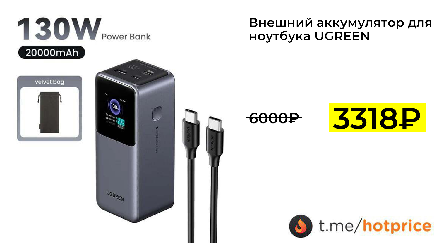 🔹 Внешний аккумулятор для ноутбука UGREEN Nexode PB721, 20000 мАч, 130 Вт за 3318₽ ❗️ (везде: 6000+₽)
