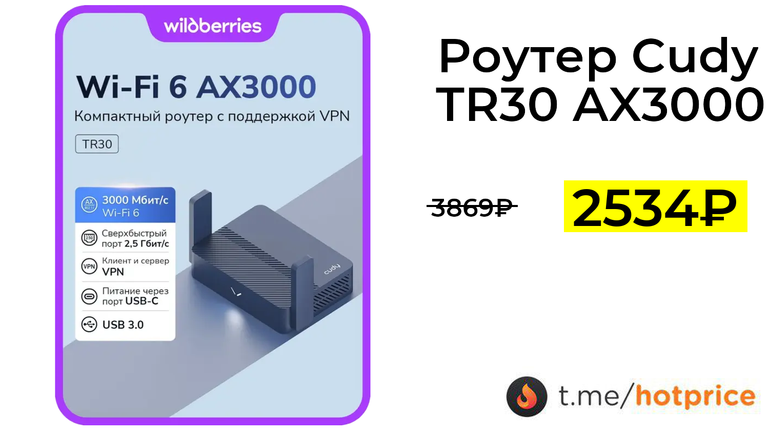 🔹 Роутер Cudy TR30 AX3000 (с WB кошельком) за 2534₽ ❗️ (везде: 3869+₽)