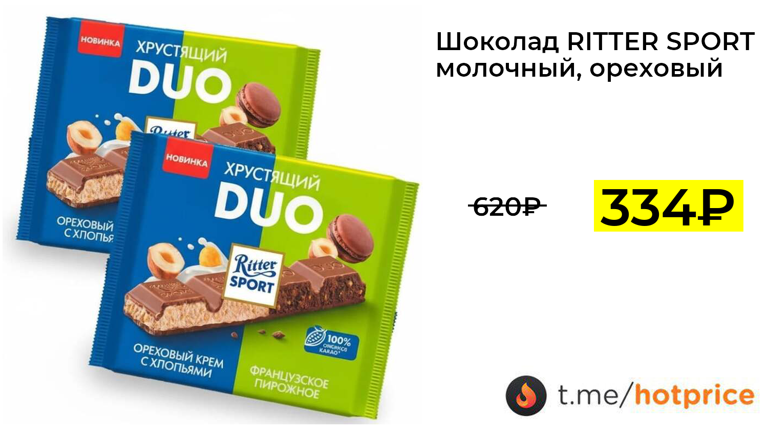 🔹 Шоколад RITTER SPORT молочный, ореховый крем с хлопьями и французское пирожное, 218 г x 2 шт (с картой OZON и бонусами продавца) за 334₽ ❗️ (везде: 620+₽)