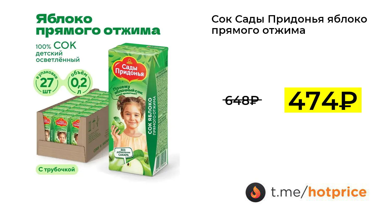 🔹 Сок Сады Придонья яблоко прямого отжима 0.2л, 27шт (с подпиской и ВБ кошельком) за 474₽ ❗️ (везде: 648+₽)