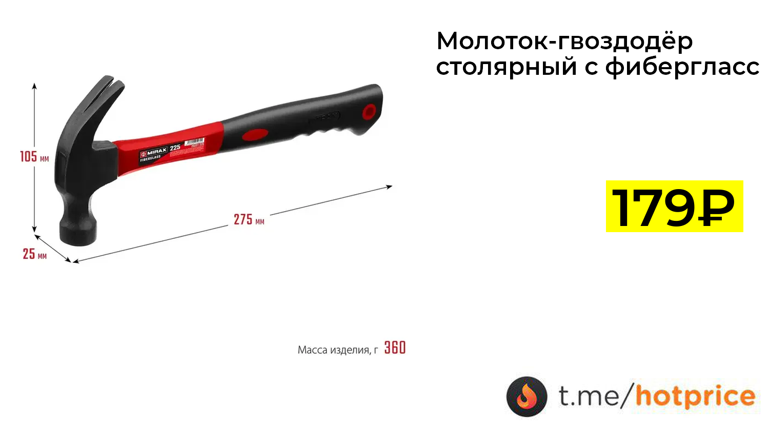 🔹 Молоток-гвоздодёр столярный с фиберглассовой рукояткой MIRAX 225 г за 179₽ ❗️