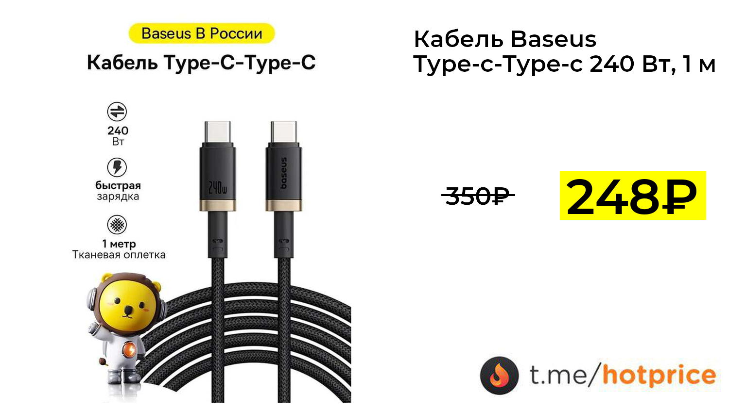 🔹 Кабель Baseus Type-c-Type-c 240 Вт, 1 м (с Ozon картой, из за рубежа) за 248₽ ❗️ (везде: 350+₽)
