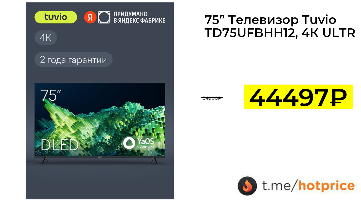 🔹 75” Телевизор Tuvio TD75UFBHH12, 4К ULTRA HD, DLED Frameless, YaOS за 44497₽ ❗️ (везде: 54900+₽)