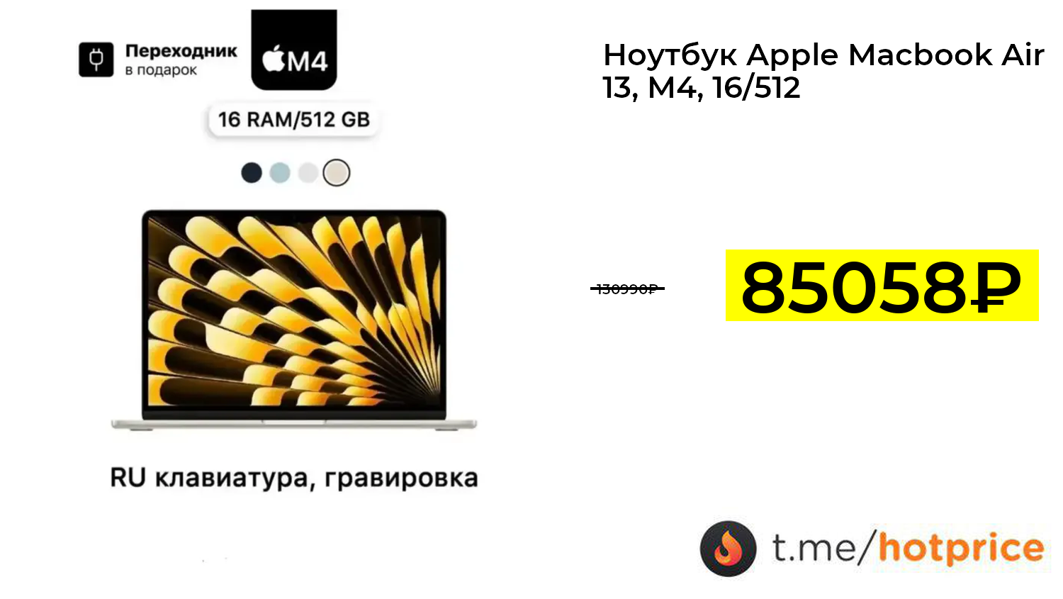 🔹 Ноутбук Apple Macbook Air 13, M4, 16/512 Гб, macOS + 500₽ за отзыв (с ВБ кошельком и подпиской) за 85058₽ ❗️ (везде: 130990+₽)