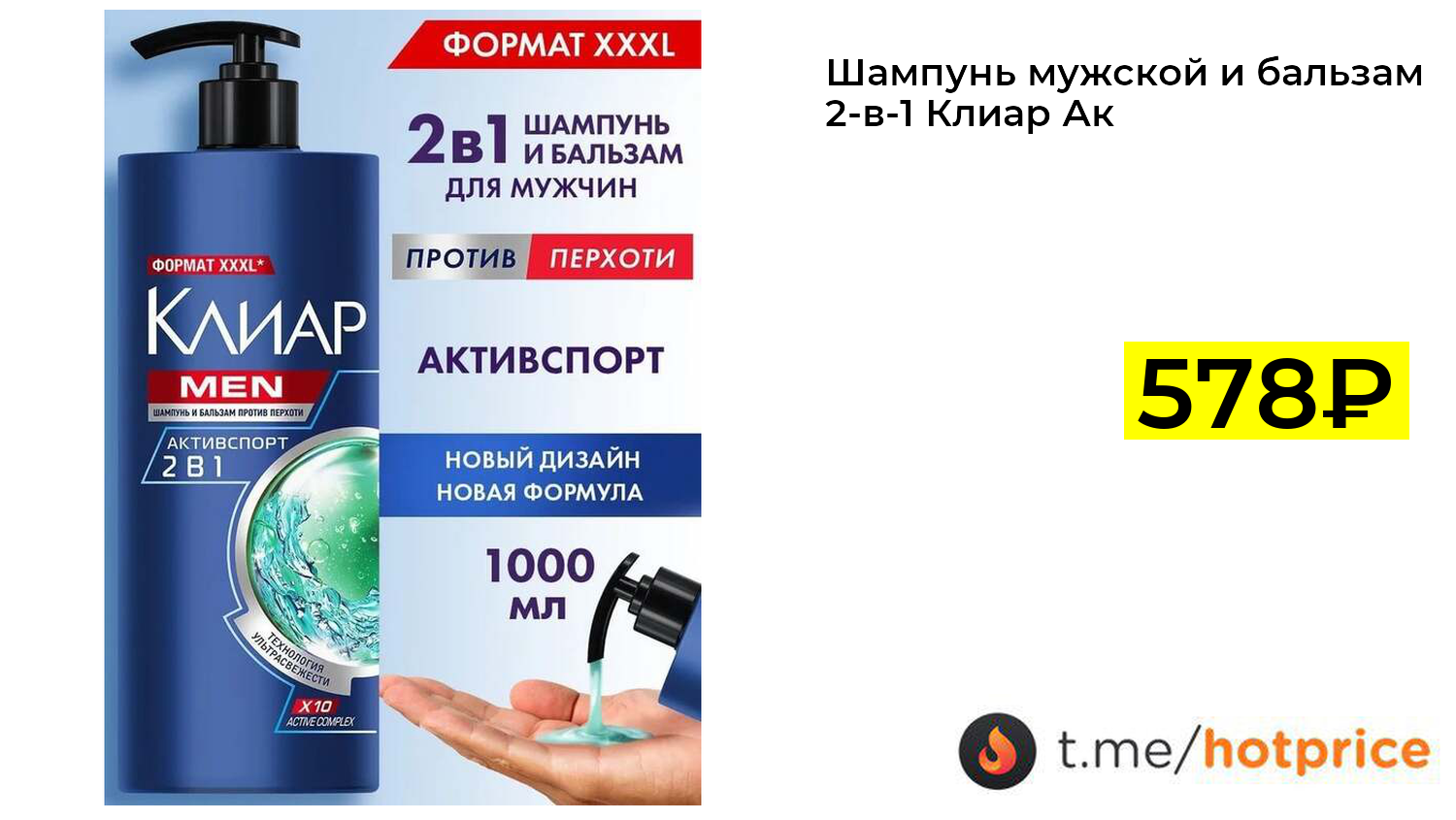 🔹 Шампунь мужской и бальзам 2-в-1 Клиар Активспорт от перхоти, 1 л + возврат баллами 50% за 578₽ ❗️