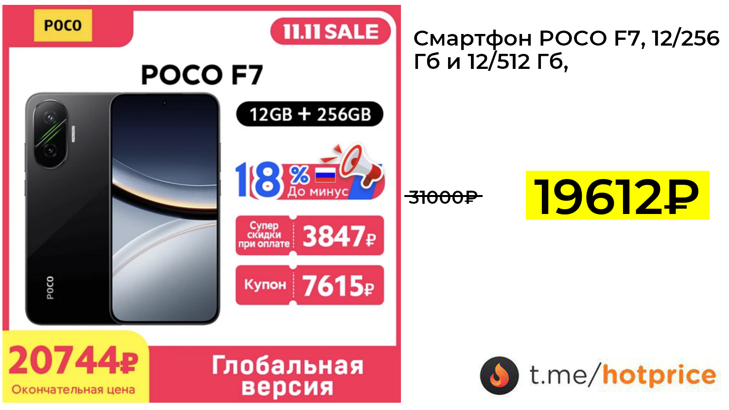 🔹 Смартфон POCO F7, 12/256 Гб и 12/512 Гб, 3 цвета, Global version (цена с купоном продавца + пошлина ~ 200₽ на 512 Гб) за 19612₽ ❗️ (везде: 31000+₽)
