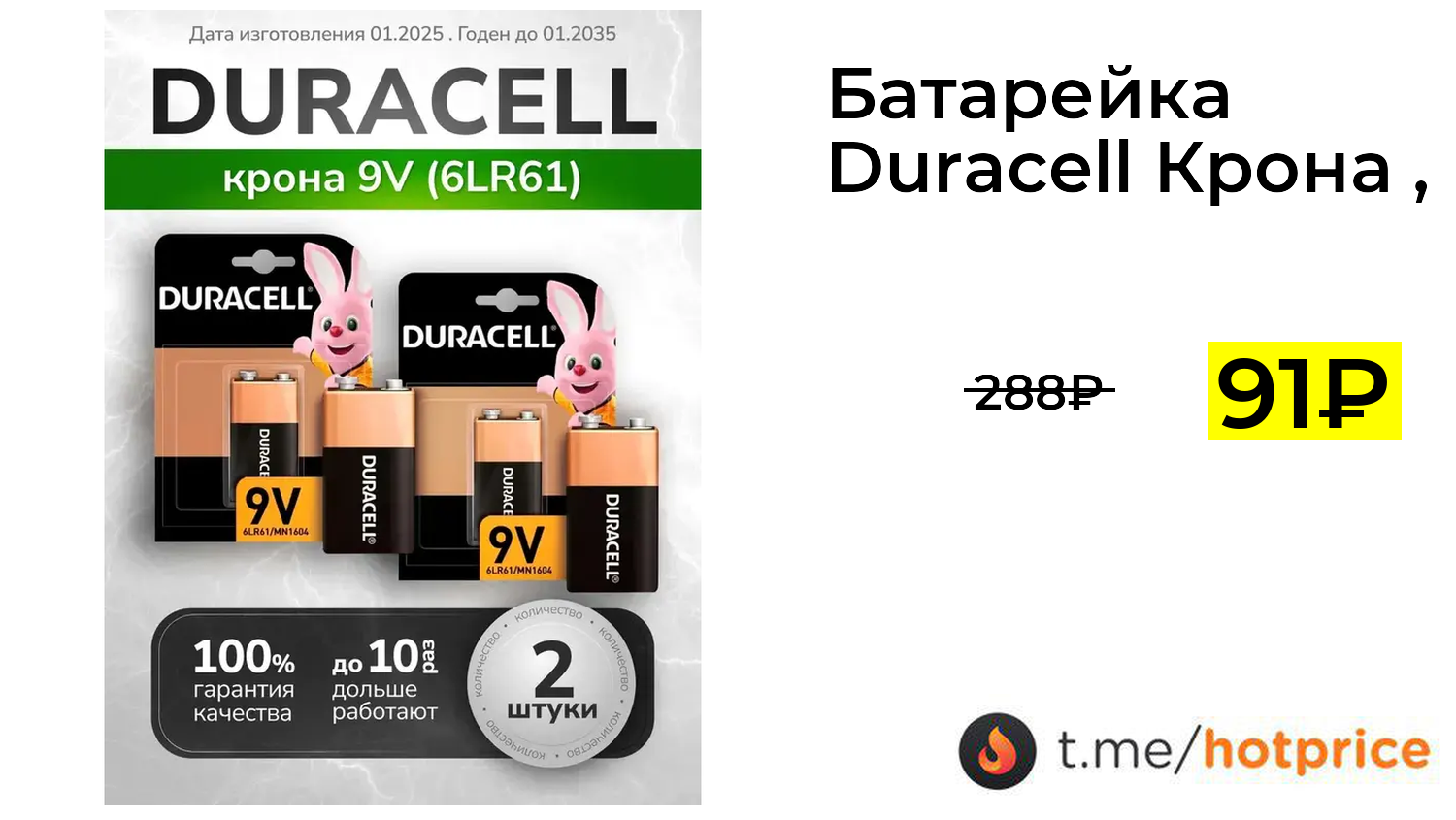 🔹 Батарейка Duracell Крона (6LR61, 1604A), 2 шт. за 91₽ ❗️ (везде: 288+₽)