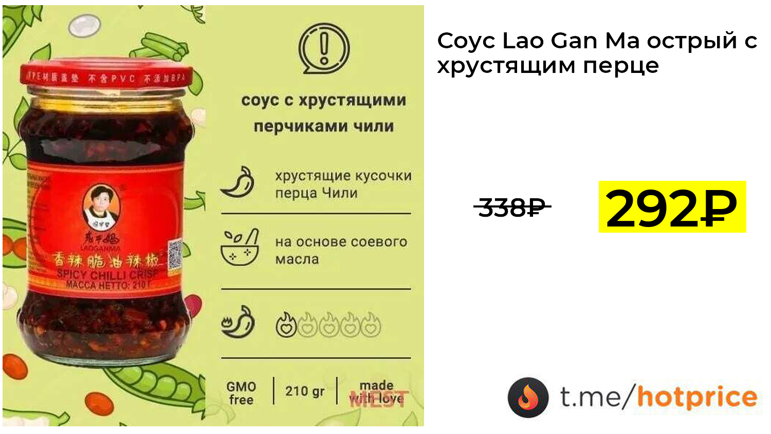 🔹 Соус Lao Gan Ma острый с хрустящим перцем чили (с картой OZON, из-за рубежа) за 292₽ ❗️ (везде: 338+₽)