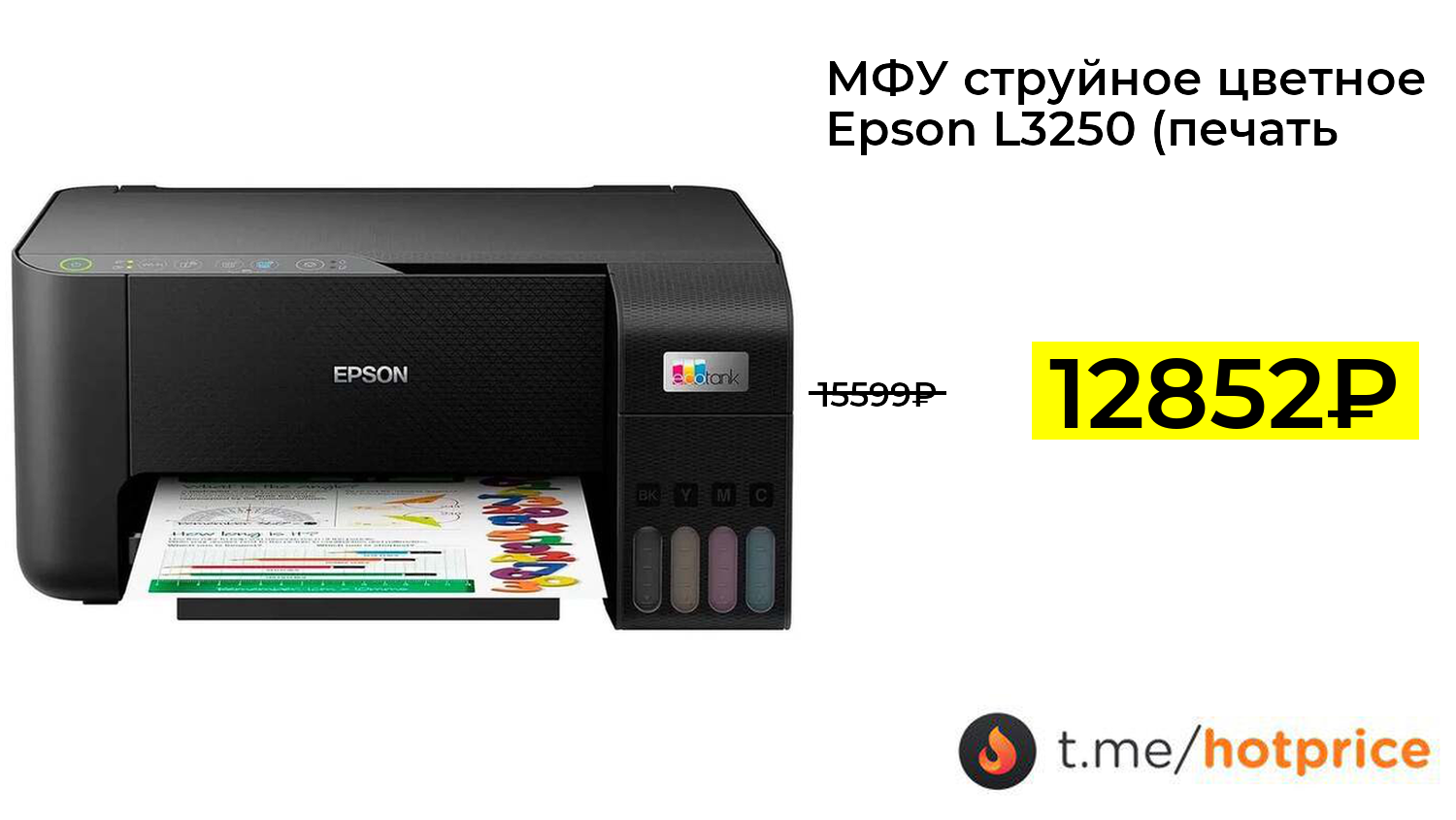 🔹 МФУ струйное цветное Epson L3250 (печать 5760x1440 dpi, СНПЧ, WiFi), с WB кошельком за 12852₽ ❗️ (везде: 15599+₽)