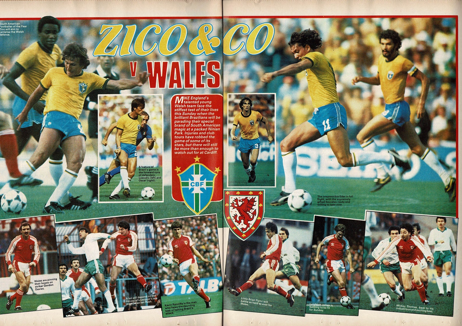 📌تصویر: پرواز تمامعیار اِدِر مهارنشدنی، در کنار سوکراتس فوقالعاده بااستعداد، آماده و مشتاق برای دریافت توپ… زیکو و یارانش در مقابل ولز؛ تیم با استعداد مایک انگلند (مربی وقت تیم ملی فوتبال ولز) این یکشنبه با سختترین آزمون زندگی خود روبرو خواهد شد، زمانی که ستارههای برزیلی جادوی آمریکای جنوبی خود را در ورزشگاه مملو از تماشاگر نینیان پارک به نمایش خواهند گذاشت؛ مصدومیتها و اردوهای باشگاهی، این بازی را از برخی از ستارههایش محروم کرده، اما هنوز هم باید مراقب ستارههای کاردیف بود؛ مجله شوت، ۱۸ ژوئن ۱۹۸۳.