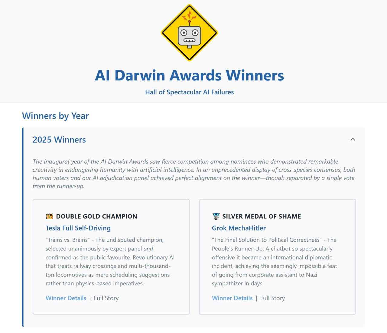 AI Darwin Awards — новая независимая премия, которая чествует тех, кто применил искусственный интеллект с поистине выдающимся пренебрежением к здравому смыслу. Девиз: "Мы не смеёмся над AI — мы смеёмся над людьми, которые используют его так, словно ничего не может пойти не так."