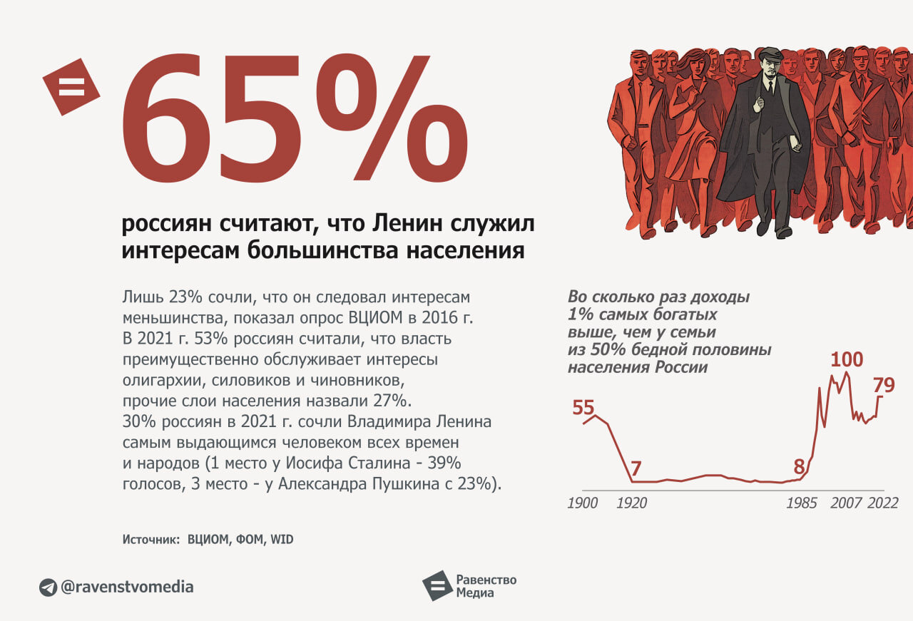 65% россиян считают, что Ленин действовал в интересах большинства или всего общества. А вот что касается власти РФ, опрошенные в 2021 г. посчитали, что она служит в основном олигархии, силовикам и чиновникам. Их назвали 53%, а прочие слои населения – 27%. С февраля 2022 г. доверие выросло, но надолго ли.