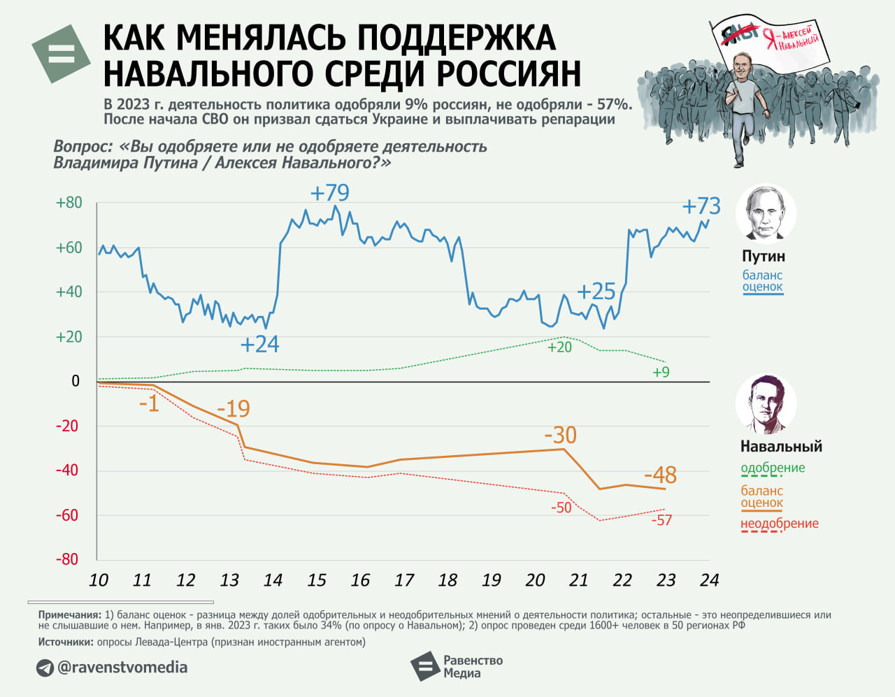 В 2023 г. сам Навальный изложил свои цели так: «демонтаж режима Путина», сдача Донбасса и Крыма, компенсации Украине. Мол, не дюже это варварам сопротивляться цивилизаторам, а за дерзость таковую надобно выслуживать прощенье. Ликвидацией ядерного оружия, судя по намекам, в том числе. В итоге одобрение упало до 9%, а негатив вырос до 57%.