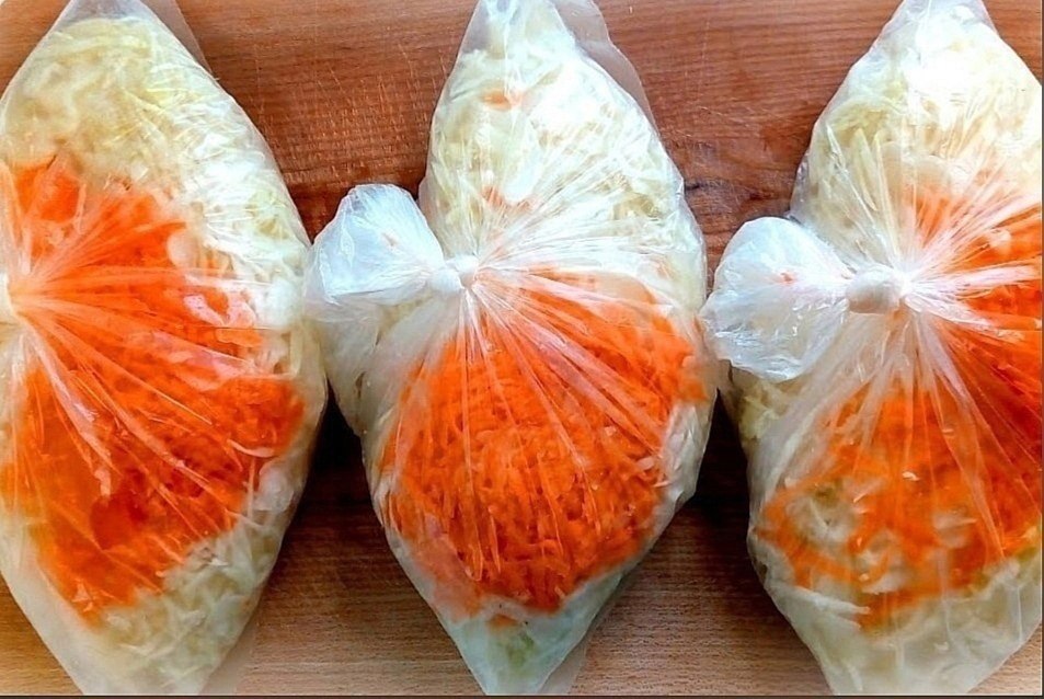 Подготовьте три пищевых полиэтиленовых пакета. Они должны быть новыми и без повреждений, чтобы капустный сок не вытекал. Разделите овощи по пакетам, свободный край завяжите.