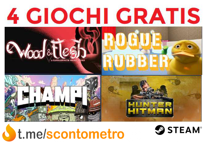 ✨Non capita tutti i giorni di portarsi a casa 4 giochi senza spendere un euro! Su Steam, per un periodo limitato, puoi riscattare GRATIS questi titoli: Wood and Flesh: A Candleforth Short Story, Rogue Rubber, Champi e Hunter Hitman.