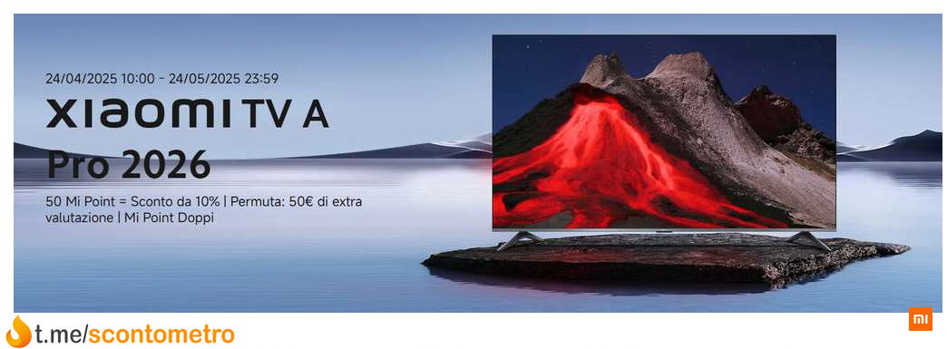 ✨ Xiaomi TV A Pro 2026 Series – In Offerta Esclusiva su mi!! Dal 24 aprile 2025 ore 10:00 al 24 maggio 2025 ore 23:59, approfitta della prima vendita ufficiale della nuova Xiaomi TV A Pro 2026: design raffinato, qualità d’immagine mozzafiato e tecnologia all’avanguardia, solo su mi.Sconti Extra, possibilità di permuta del tuo usato e doppi punti.