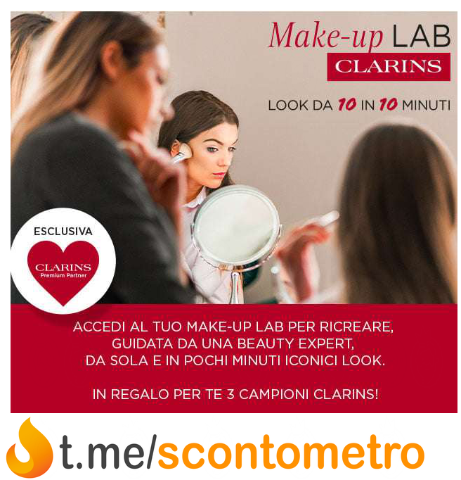✨Promozione da Clarins! Ti basterà iscriverti al Make-up LAB e selezionare il punto vendita più vicino. Riceverai al più presto via e-mail il Vip Pass con tutte le informazioni per prenotare il tuo appuntamento presso il Clarins Premium Partner da te selezionato, al temine del Lab riceverai 3 campioni GRATIS!